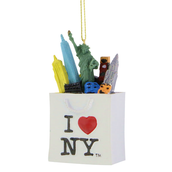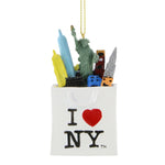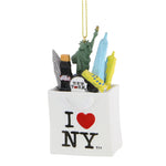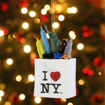 I LOVE NY Christmas ornament with the NYC skyline in an I LOVE NY shopping bag.